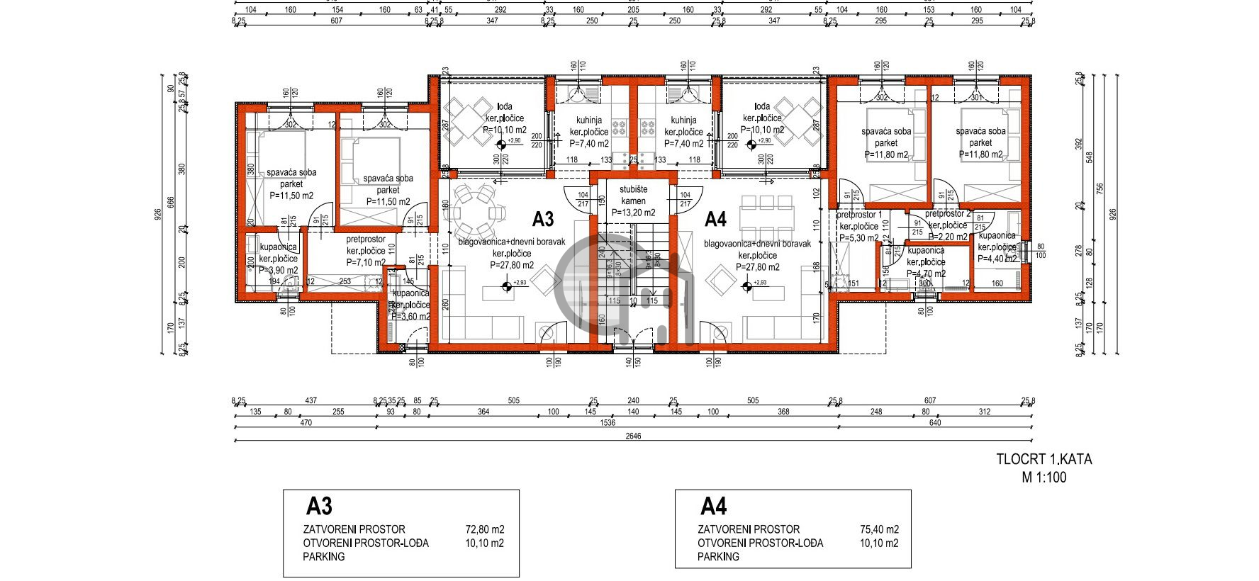 S4- dining room, kitchen, 2 bedrooms, 2 bathrooms, 2 hallways, loggia and parking space. Total housing: 75.40 m2 + loggia 7.6 m2 + parking 13.25 m2 = 297,000.00 EUR