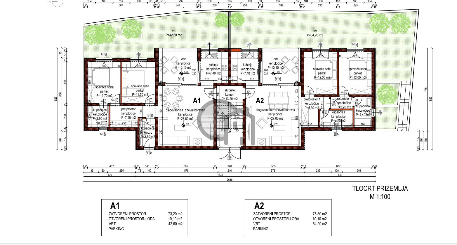 S2- dining room, kitchen, 2 bedrooms, 2 bathrooms, 2 hallways, loggia and parking space. Total housing: 75.8 m2 + loggia 7.6 m2 + parking 13.25 m2 + garden = 280,000.00 EUR