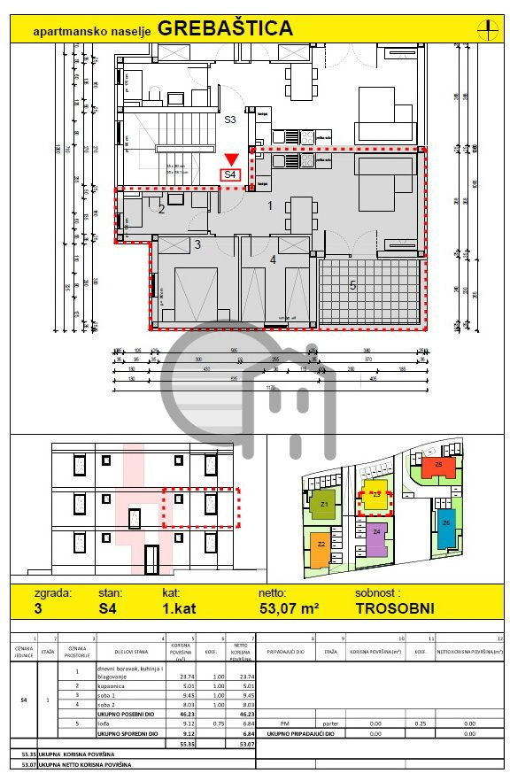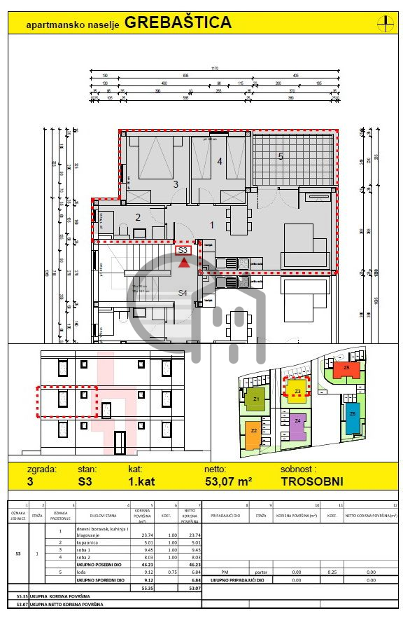 Apartment S3 - €182,000.00 Apartment S3 is located on the first floor, with a total net usable area of 53.07 m2. It consists of two bedrooms, bathroom, living room, kitchen and dining room and a loggia. Apartment S4 - €188,000.00 - SOLD