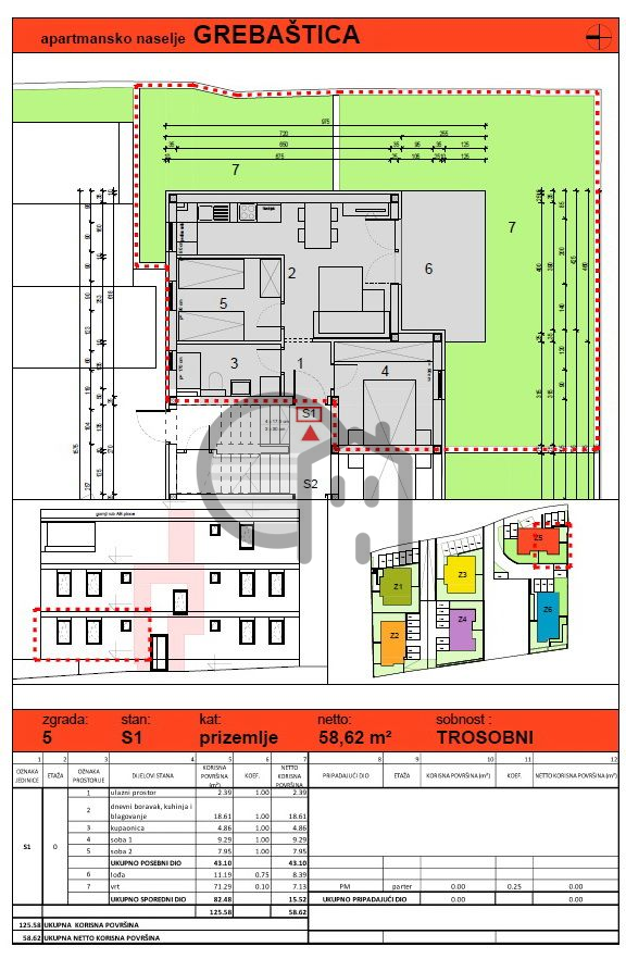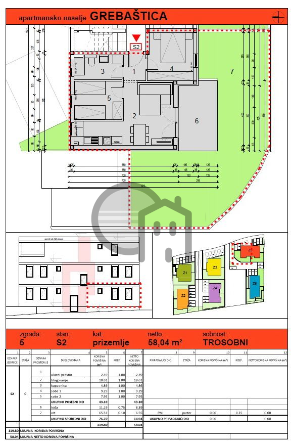 Apartment S1 - €204,000.00 Apartment S1 is located on the ground floor. It consists of an entrance area, two bedrooms, a bathroom, a kitchen, a living room and an open space concept dining room with an exit to the loggia. It has a garden of 71.29 m2. Total net usable area 58.62 m2. -SOLD