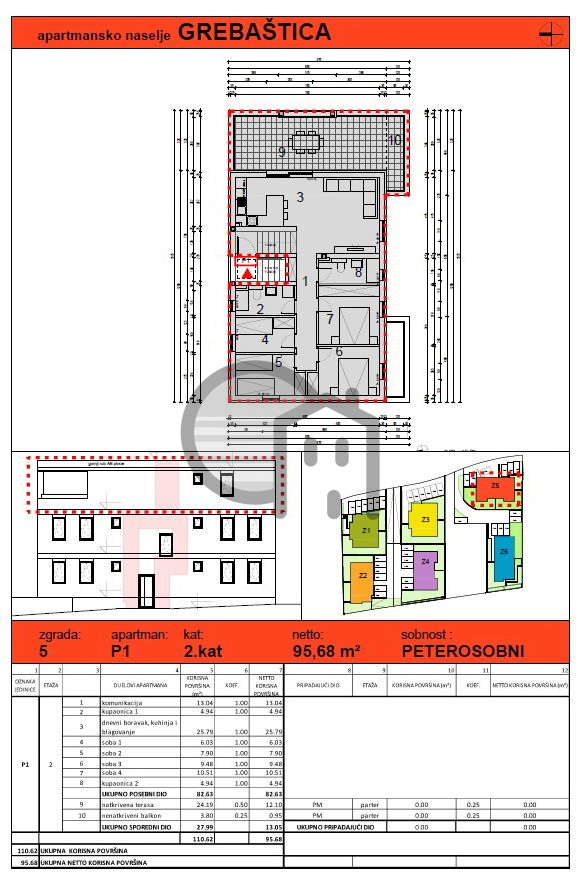 P1 - Penthouse - €359,000.00 The commercial unit – apartment P-1 – is located on the second floor and consists of a hallway, two bathrooms, a living room with kitchen and dining area, and four bedrooms with a total net usable area of 81.50 m². The auxiliary parts of the apartment include: Loggia 1 with a net usable area of 24.85 m² and an uncovered balcony with a net usable area of 4.60 m², as well as the associated annexes: storage room SP1 on the ground floor with a net usable area of 3.93 m², parking space PM-4 with a net usable area of 13.45 m², and parking space PM-5 with a net usable area of 12.80 m².