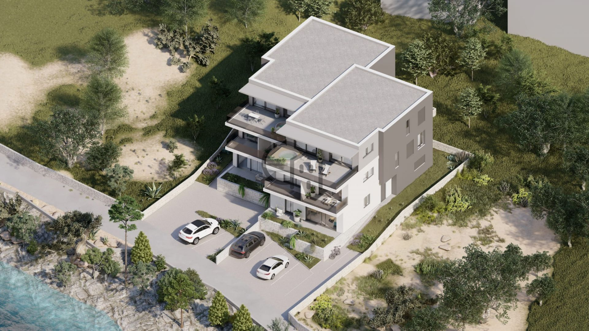 Novogradnja, prvi red od mora, dvosoban apartman sa ukupno 93,56m2 korisne površine, a nalazi se u prizemlju stambene zgrade koja ima ukupno tri etaže sa ukupno 5 stambenih jedinica, a orijentiran je na sjeverozapadnu stranu. Apartman se sastoji od kuhinje, blagovaone i dnevnog boravka u cjelini, ostava, wc, 3 hodnika, dvije spavaće sobe i kupaonice. Apartmanu pripada vrt 149,37m2, te jedno parkirno mjesto. Apartman nije namješten, biti će građen od visoko kvalitetnih materijala, opremljen klima uređajima u svim sobama, podno grijanje u kupaonici, električni podizači roleta, komarnici, video-portafon. Useljenje predviđeno za ljeto 2024. Kupci su oslobođeni plaćanja poreza na promet nekretnina.