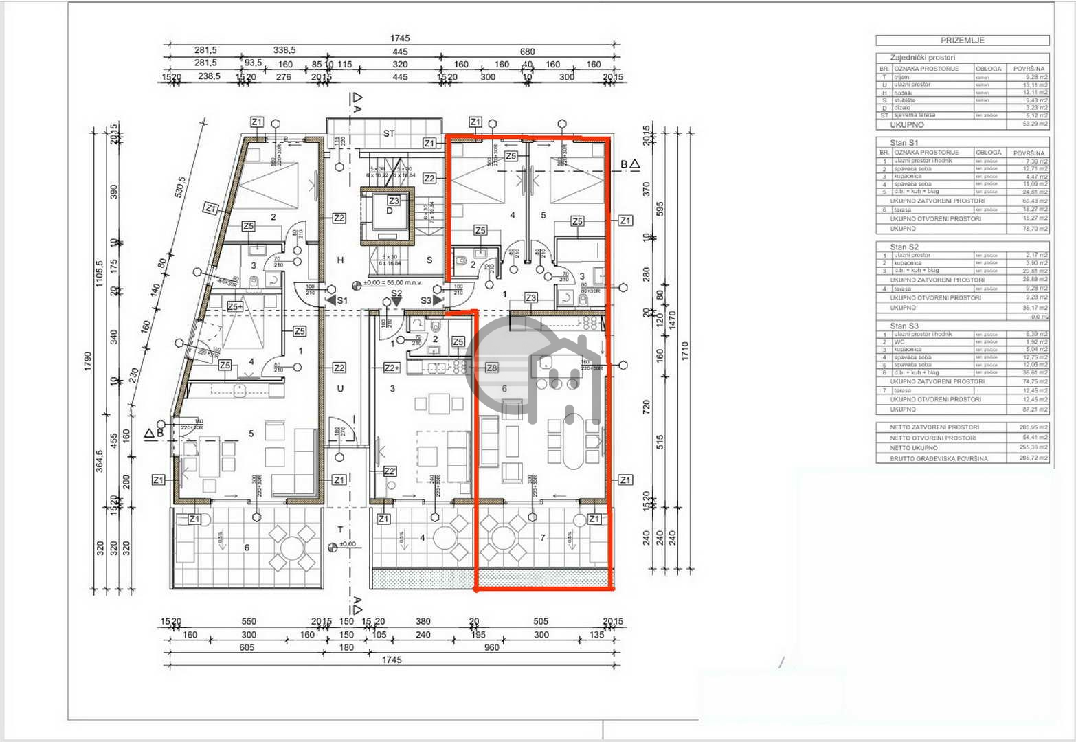 S3- Stan ima zatvorenu površinu od 74,75 m², te natkrivenu terasu površine 12,45 m². Ukupna neto korisna površina iznosi 87,21 m². Sastoji se od dnevnog boravka s kuhinjom i blagovaonicom, natkrivene terase, 2 spavaće sobe i kupaonice. Orijentacija stana je jug, istok i sjever.