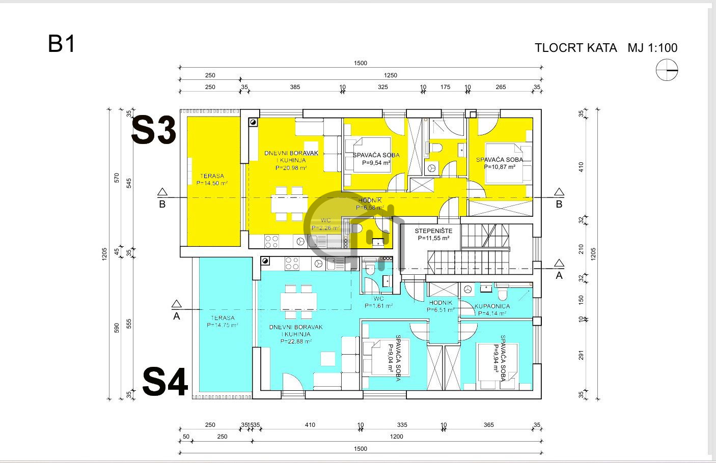 Stan S4- kuhinja, blagovaonica, dnevni boravak , hodnik, wc, 2 spavaće sobe, terasa površine 14,75 m2, spremište, parking, Korisna površina je 72,62 m2, a cijena 471.000,00 EUR.