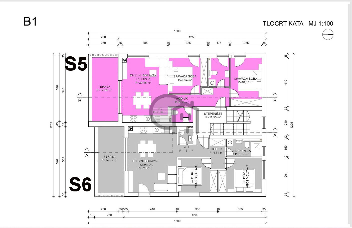Stan S5- kuhinja, blagovaonica, dnevni boravak , hodnik, wc, 2 spavaće sobe, terasa površine 14,50 m2, spremište, parking. Korisna površina je 72,50 m2, a cijena 470.000,00 EUR.
