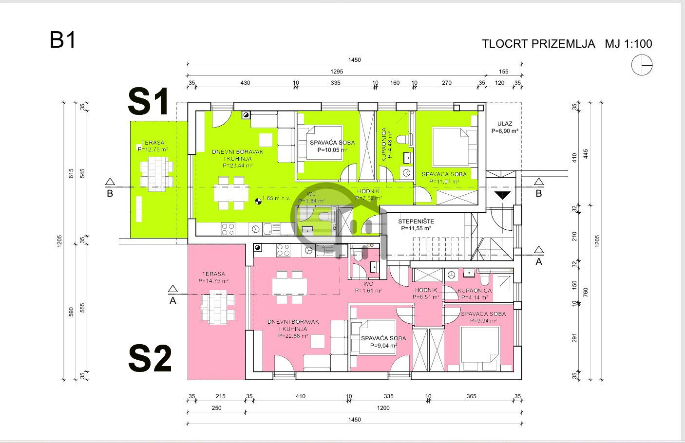 Stan S1- kuhinja, blagovaonica, dnevni boravak , hodnik, wc, 2 spavaće sobe, terasa površine 12,75m2, spremište, parking, te vrt površine 18m2. Korisna površina je 77,60 m2, a cijena 497.000,00 EUR.
